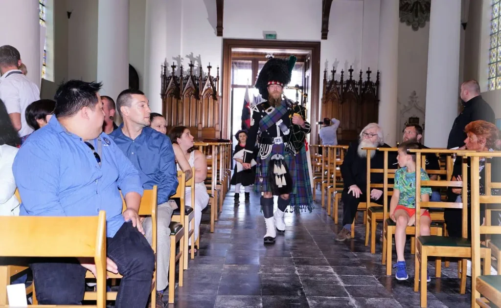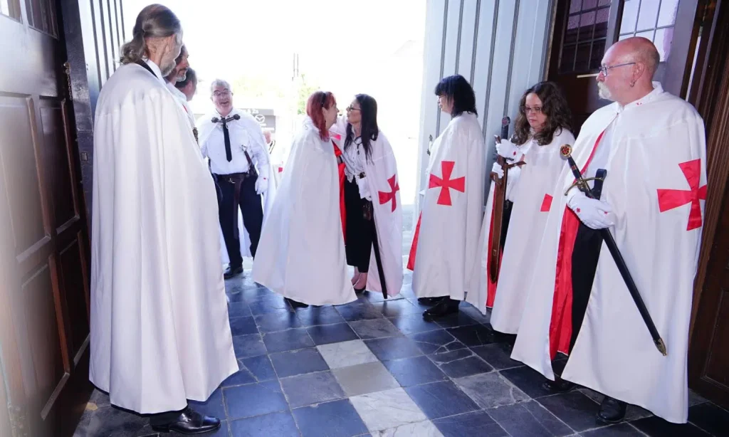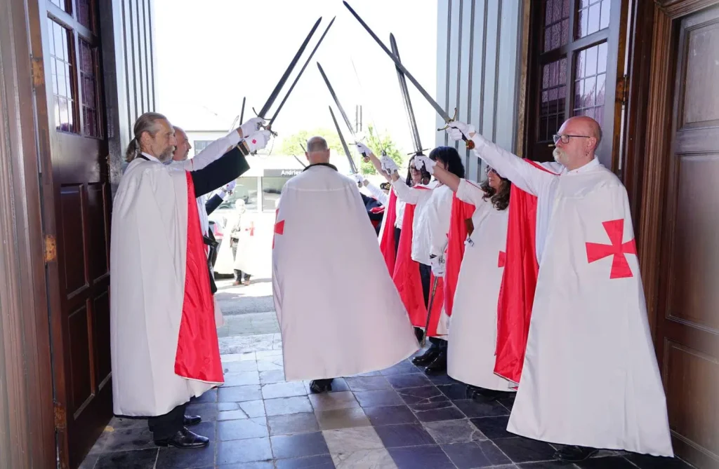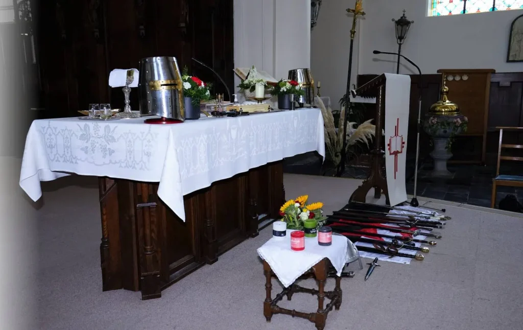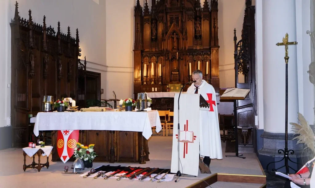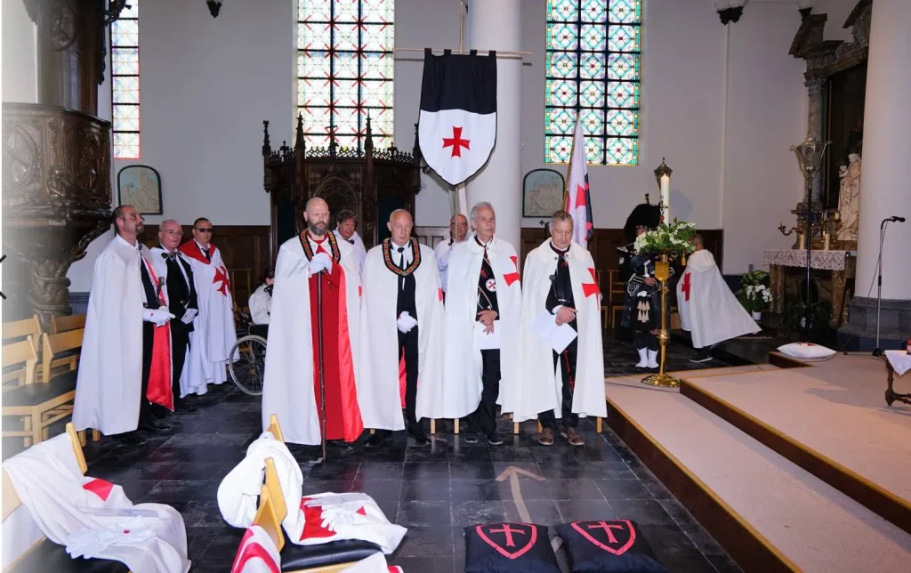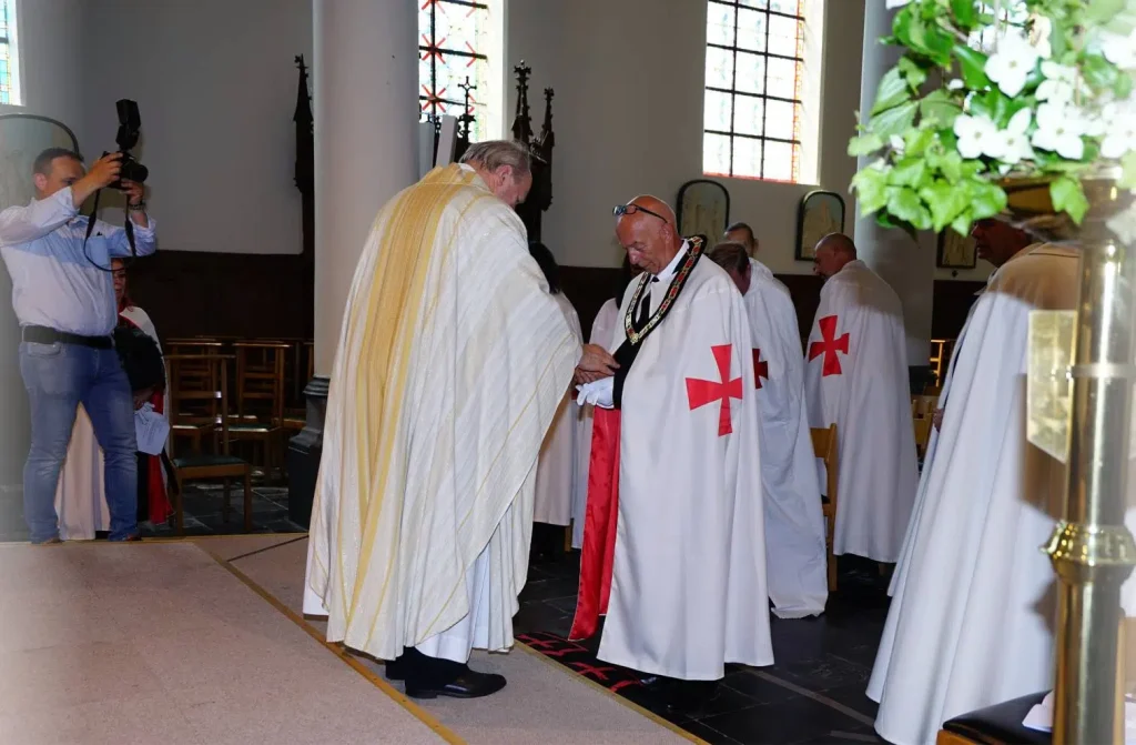 The German Grand Priory is proud to announce that 7 new Knights and Dames have been confirmed during the knighting ceremony of June 4, 2022, in the Belgian Saint-Antoniuschurch of the town of Viane, close to Geraardsbergen. OSMTJ Germany, under the leadership of Grand Prior br. Martin Watzlawig, assisted by brother Grand Chancellor br. Frank De Bie, sor Rita Scherer, br. Rudi Kennes and br Koen Vanermen, also had the pleasure of welcoming 12ย additional Knights and Dames into the Order, cementing a new bond with Belgium, Luxemburg and Germany, as well as hosting the ceremony for br Edwin Tuytens, Prior Flandria et Germania. With the ceremony, the Priories Templari Gรฉrard de Villers (Belgium) and Luxemburg & Sรผd Eiffel, are added to the growing list to represent OSMTJ in the best of light and to the best of their abilities.ย Under the tones and with the guidance of a true bagpiper from Ghent District Highlanders Pipe Band, sir Kevin De Backer, the ceremony was completed in accordance with the old customs and rituals, as decreed by our esteemed Grand Master, Brig. Gen. (ret) br. Ronald Mangum, under the watchful eye of our Lord Jesus Christ.