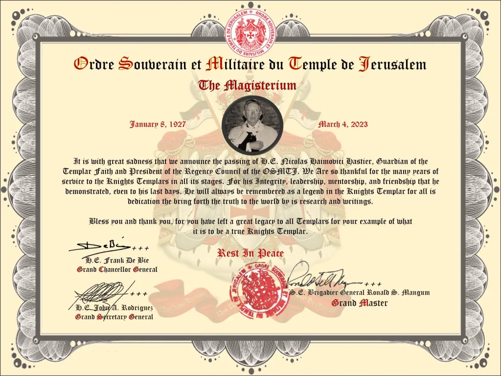 It is with terrible sadness that we must report the passing of our former leader, H.E. Nicolas Haimovici Hastier, Guardian of Templar Faith and President of the Council of Regency of the OSMTJ for over twenty years.